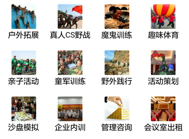 經(jīng)典拓展 組織運(yùn)動(dòng) 趣味團(tuán)建 水上團(tuán)建 工匠/藝術(shù) 戶外領(lǐng)導(dǎo)力 沙盤/科技 黨性文化 企業(yè)內(nèi)訓(xùn)+創(chuàng)意團(tuán)建